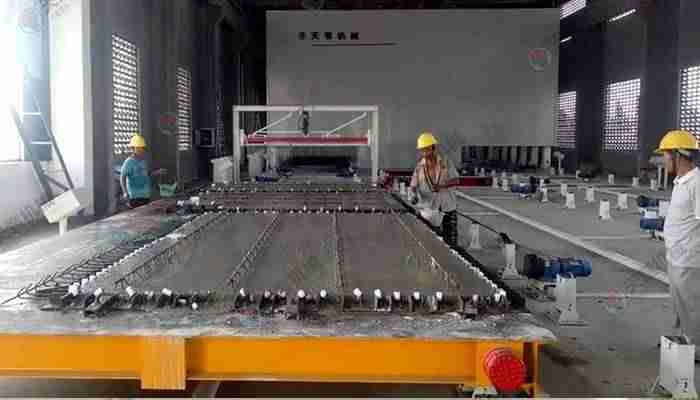 PC環(huán)形疊合板生產(chǎn)線采用高精度、高結(jié)構(gòu)強度的成型模具,經(jīng)自動布料機把混凝土澆筑其中、振動臺振搗后并不立即脫模