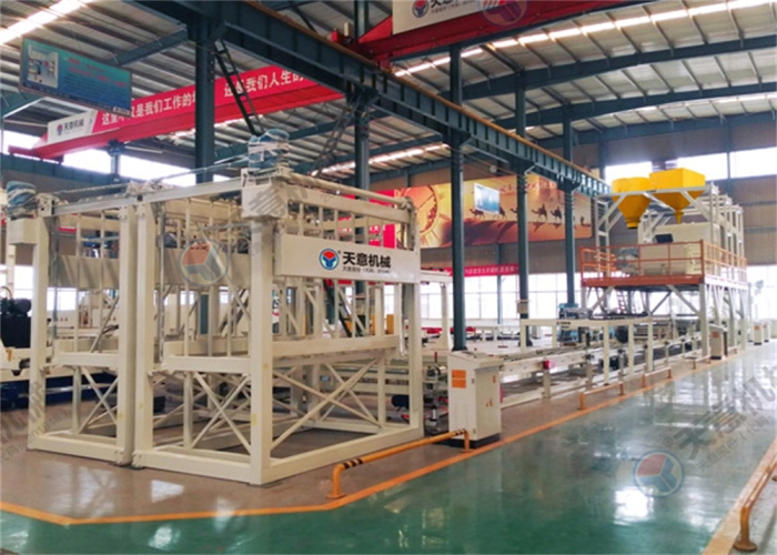 成型輸送線主要由上板輸送線、成型輸送線,加速整理輸送線及送板主機(jī)、布料主機(jī)、刮平裝置、玻纖網(wǎng)格布架等組成,主要功能是把漿料鋪設(shè)在EPS基板上并完成產(chǎn)品的成型,且輔助完成兩端雙工位碼垛機(jī)的上下架。