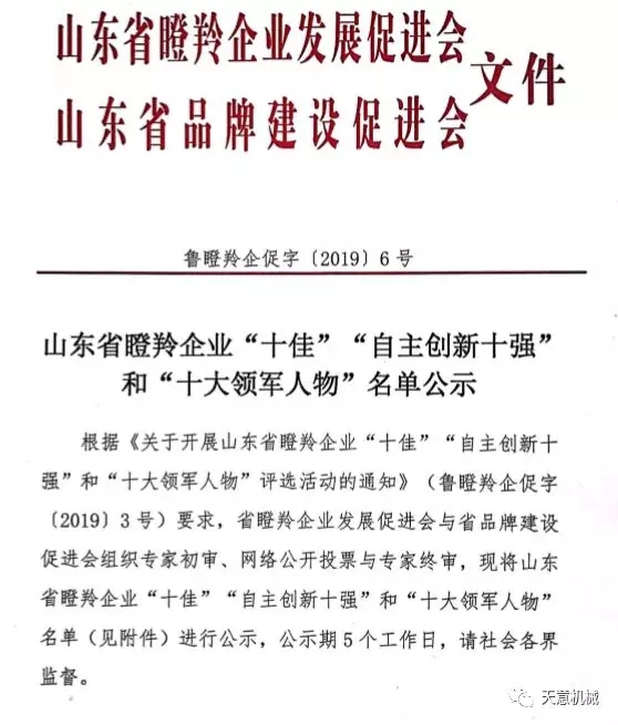 根據(jù)《關(guān)于開展山東省瞪羚企業(yè)十佳”“自主創(chuàng)新十強(qiáng)十大領(lǐng)軍人物評選活動(dòng)的通知》(魯?shù)闪缙蟠僮帧?/span>20193號)要求,2019126日,山東省瞪羚企業(yè)發(fā)展促進(jìn)會(huì)、山東省品牌建設(shè)促進(jìn)會(huì)發(fā)布魯?shù)闪缙蟠僮?/span>[2019]6號文,公布經(jīng)過專家初審、網(wǎng)絡(luò)公開投票與專家終審,評選出了山東省瞪羚企業(yè)十佳、自主創(chuàng)新十強(qiáng)十大領(lǐng)軍人物。天意機(jī)械榮獲“山東省十佳瞪羚企業(yè)”稱號。