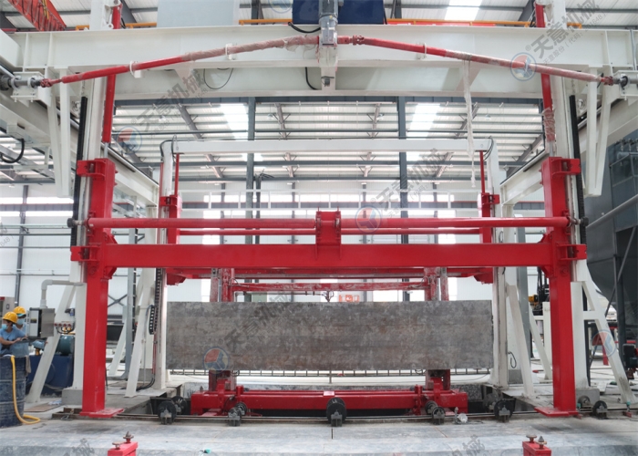 脫模后的坯體連同側(cè)板一起放置在切割小車上,切割小車由減速電機(jī)驅(qū)動行走,通過縱向切割機(jī)完成縱向切割,切割小車?yán)^續(xù)行走至橫向 切割機(jī)中間位置停止后,由小車置換裝置將側(cè)板連同坯體抬起,切割小車退回翻轉(zhuǎn)行車底下進(jìn)行下一次承載脫模后的坯體,另外一部切割小車 進(jìn)入置換裝置底下后, 置換裝置將側(cè)板連同坯體放置該切割小車上后,橫向切割動作后啟動進(jìn)行橫向切割動作,切割完成后,切割小車再行走至地行車底下,再由 翻轉(zhuǎn)去底行車將坯體去底(連側(cè)板)吊至蒸養(yǎng)小車上,切割小車范圍原始位置進(jìn)行下一個切割循環(huán)。